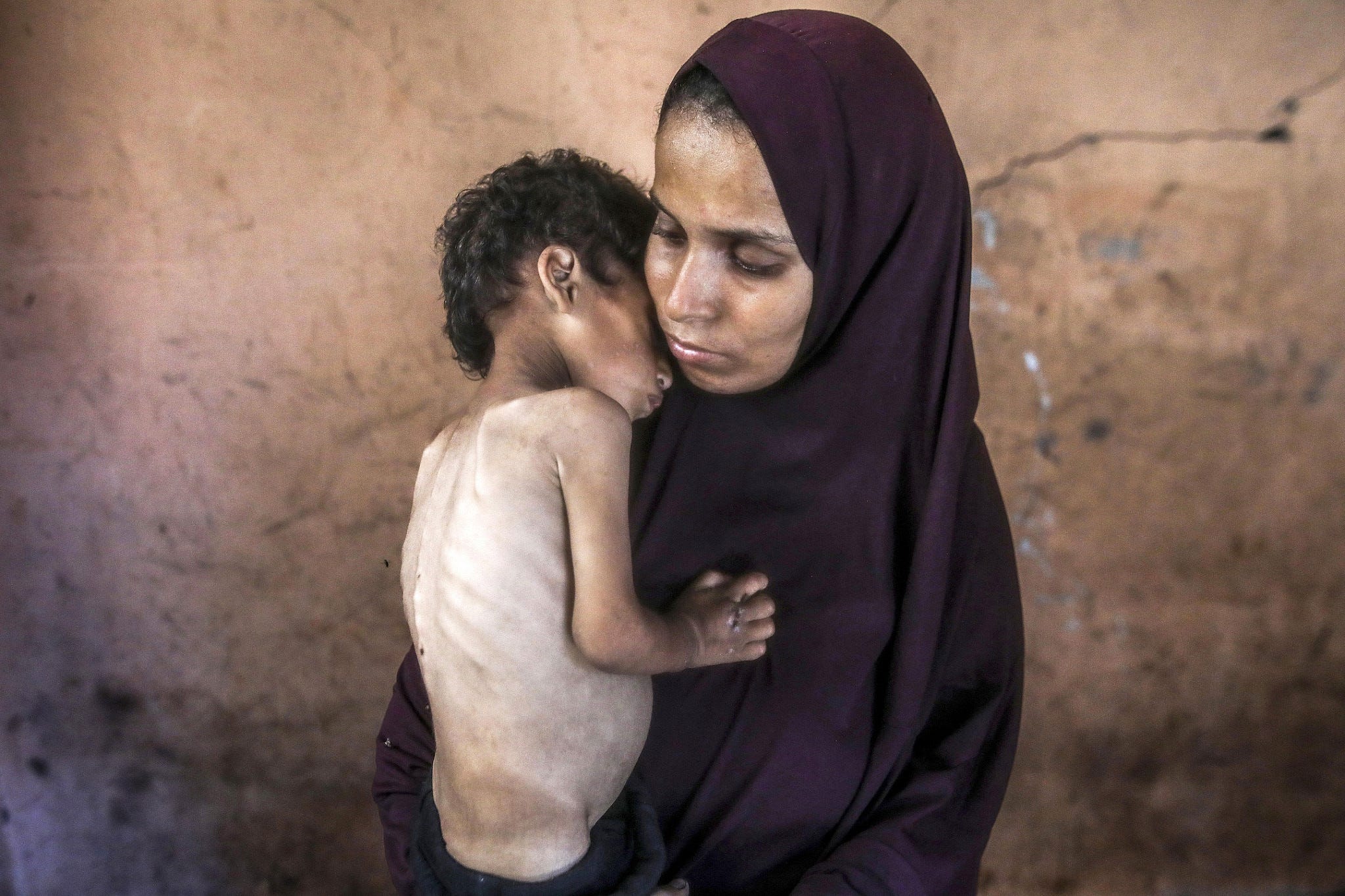 Yazan Abu Foul, di due anni, che soffre di grave malnutrizione, è detenuto da sua madre, nel campo profughi di Al-Shati, nella parte occidentale di Gaza City, il 19 luglio 2025. (Yousef Zaanoun/Attivestills)